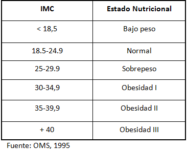 Luego que ya determinaste tu índice de masa corporal te buscas en la siguiente tabla: