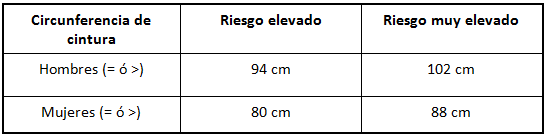 En el ejemplo anterior la persona tiene un estado nutricional normal. Ahora con la cinta métrica pásatela por la cintura (a nivel del ombligo) y mídete la circunferencia de cintura. Con esa medida podrás conocer tu riesgo cardiovascular, ubicándola en la tabla que se presenta más abajo. El riesgo cardiovascular, estará determinado de acuerdo a cómo esté distribuida la grasa corporal (esos kilitos de más). No es lo mismo que tengamos mayor cantidad de grasa en la zona de las caderas, a que la tengamos a nivel del abdomen. En esta zona, el riesgo cardiovascular es mayor, digamos que el corazón trabaja más forzado.