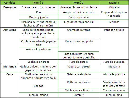 Para favorecer el crecimiento, el desarrollo y el buen estado de salud en cada comida se deben incluir alimentos de los distintos grupos, de los llamados constructores, como por ejemplo carne, leche, yogurt, quesos y huevos; los energéticos como granos, cereales, tubérculos, plátano, grasas y azúcares y los controladores o reguladores como las frutas y vegetales.