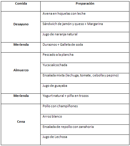 Incluye en tu menú alimentos de todos los grupos: granos, cereales, tubérculos y plátanos; hortalizas y frutas; leche, carnes y huevos; grasas y aceites y azúcares (azúcar blanca, papelón, miel) este último grupo consúmelo con moderación.