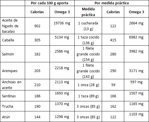 CONTENIDO DE CALORÍAS Y ACIDOS GRASOS OMEGA 3 POR CADA 100G
