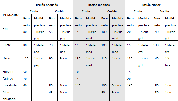 Para consumir los 240 g de pescado recomendados a la semana debemos conocer que una lata de atún pequeña contiene alrededor de 140 g y con un peso escurrido alrededor de los 98 g. Un filete mediano de pescado pesa aproximadamente 120 g y una rueda mediana de pescado tipo carite pesa 100 g. Es conveniente el uso de una balanza para conocer más fácilmente sus porciones.