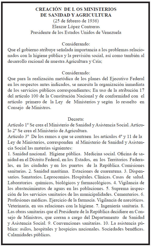 La Creación de las Instituciones de Salud. El Ministerio de Sanidad y Asistencia Social nace según decreto del 25 de Febrero 1936.