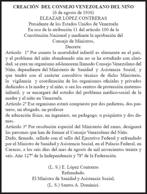 Por otro lado, el 06 de agosto de 1936 se crea el Consejo Venezolano del Niño, presidido por Gustavo H. Machado, así como el Instituto Nacional de Puericultura presidido por Pastor Oropeza. En Diciembre de ese año se inaugura el Hospital Municipal de Niños en la esquina de Los Pirineos; su primer Director fue Gustavo H. Machado lo acompañaron un grupo de eminentes pediatras: Pastor Oropeza, Guillermo Hernández Zozaya, Nicolás Cárdenas Farías, Espíritu Santo Mendoza, Simón Gómez Malaret, Andrés Gutiérrez Solís. En 1938 se inaugura la Maternidad Concepción Palacios y su primer director fue Leopoldo Aguerrevere.