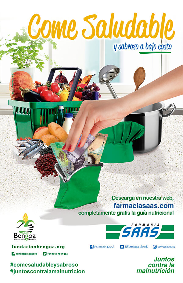 "Esta es la onceava guía de orientación nutricional que desarrollamos conjuntamente Farmacia SAAS y Fundación Bengoa en el marco de la campaña Juntos contra la Malnutrición, que viene haciendo esfuerzos desde hace trece años por aportar un granito de arena en el tema de la alimentación en Venezuela", apunta Nakarith Galicia, Gerente de RSE y Comunicaciones de Farmacia SAAS. "Su objetivo es alertar, orientar y ayudar a propiciar cambios en los hábitos alimentarios de la población, aspecto en el que radica el problema de la malnutrición en el país."