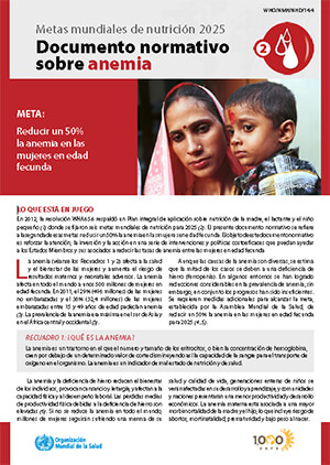 En 2012, la resolución WHA65.6 respaldó un Plan integral de aplicación sobre nutrición de la madre, el lactante y el niño pequeño (1) donde se fijaron seis metas mundiales de nutrición para 2025 (2). El presente documento normativo se refiere a la segunda de esas metas: reducir un 50% la anemia en las mujeres en edad fecunda. El objeto de este documento normativo es reforzar la atención, la inversión y la acción en una serie de intervenciones y políticas costoeficaces que puedan ayudar a los Estados Miembros y sus asociados a reducir las tasas de anemia entre las mujeres en edad fecunda