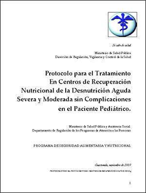 Siendo la Seguridad Alimentaria y Nutricional un tema prioritario para el Ministerio de Salud Pública y Asistencia Social, se ha considerado conveniente realizar una revisión y actualización del protocolo del manejo de la desnutrición aguda severa y moderada sin complicaciones en el paciente pediátrico y de ésta manera fortalecer la estrategia de abordaje a la desnutrición en Guatemala de una manera integral y técnica, sabiendo que la desnutrición es el estado de manifestaciones clínicas, bioquímicas y antropométricas causadas por la deficiente ingesta y que son las complicaciones las que deben ser atendidas luego del egreso del niño del nivel hospitalario continuando con su tratamiento en el Centro de Recuperación Nutricional cuando el caso lo amerite. Esta línea de acción requiere la actualización del personal de salud en el manejo apropiado de casos.